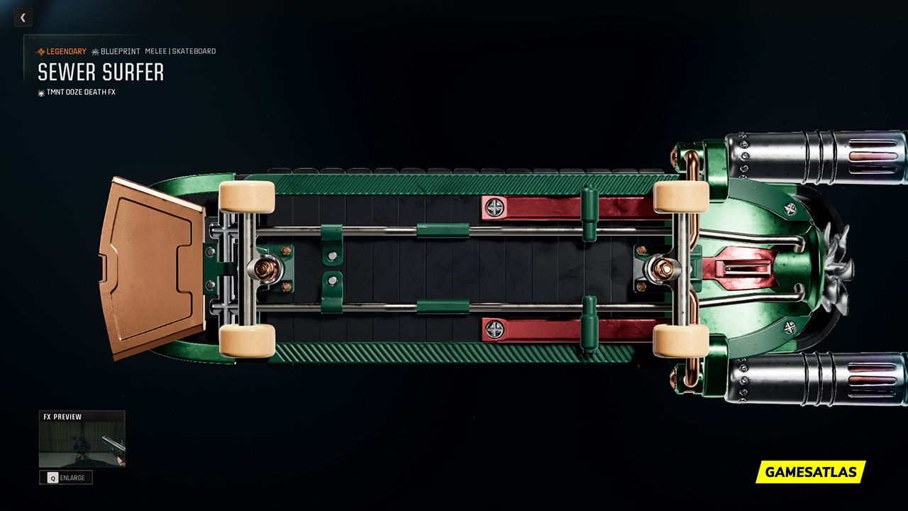 The attachments for the Sewer Surfer Blueprint can be seen in the picture above. You can build your own Sewer Surfer weapon Blueprint in Call of Duty: Black Ops 6 and Call of Duty: Warzone by adding these attachments on a base Skateboard in the Gunsmith menu.