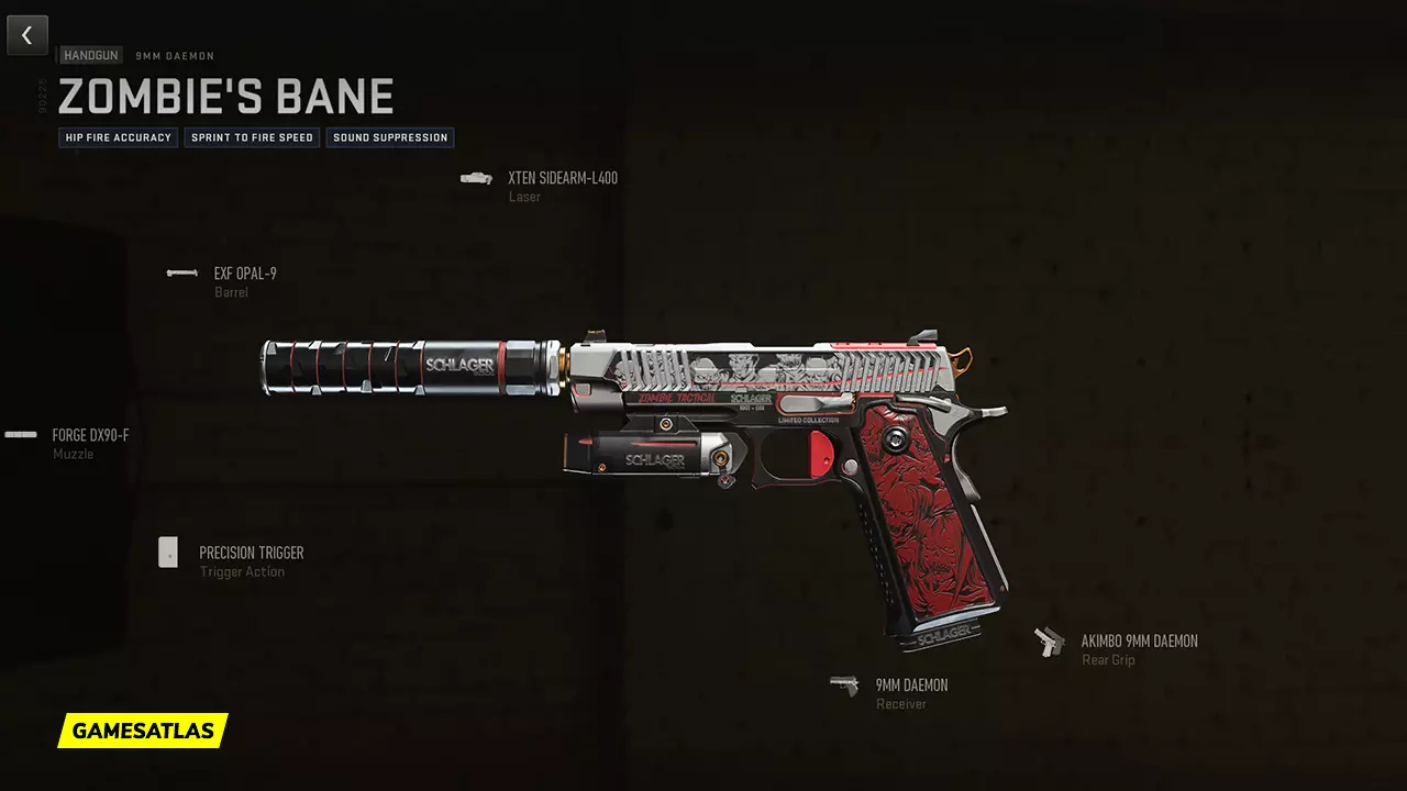You can build your own Zombie's Bane weapon Blueprint by adding these attachments on a base 9mm Daemon in the Gunsmith menu.